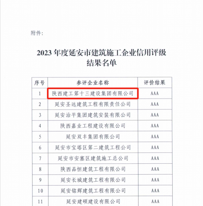 同時,延安市建協(xié)公布了2023年度延安市建筑施工企業(yè)信用評級結(jié)果:陜建十三建集團被評為AAA級企業(yè)。